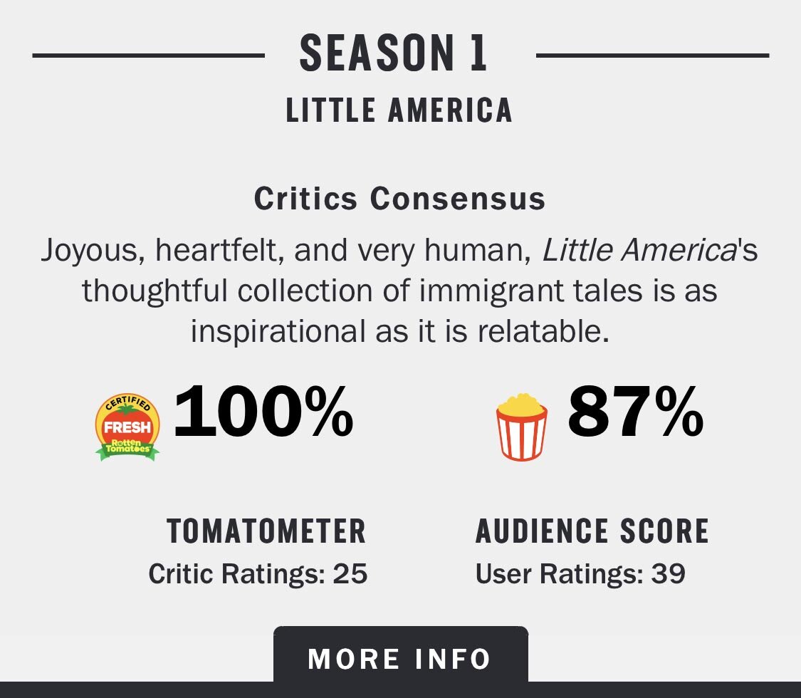 Однако стоит подчеркнуть, что оценок и рецензий Little America на Rotten Tomatoes пока не столь много — тот же «Утреннее шоу» критики оценили почти сто раз, а тут в четыре раза меньше. Да и будем откровенны: «Утреннее шоу» бьёт в другую мозоль американцев, вызывающую много сильных споров даже среди союзников, находящихся по разные стороны баррикад мозоли «Маленькой Америки».