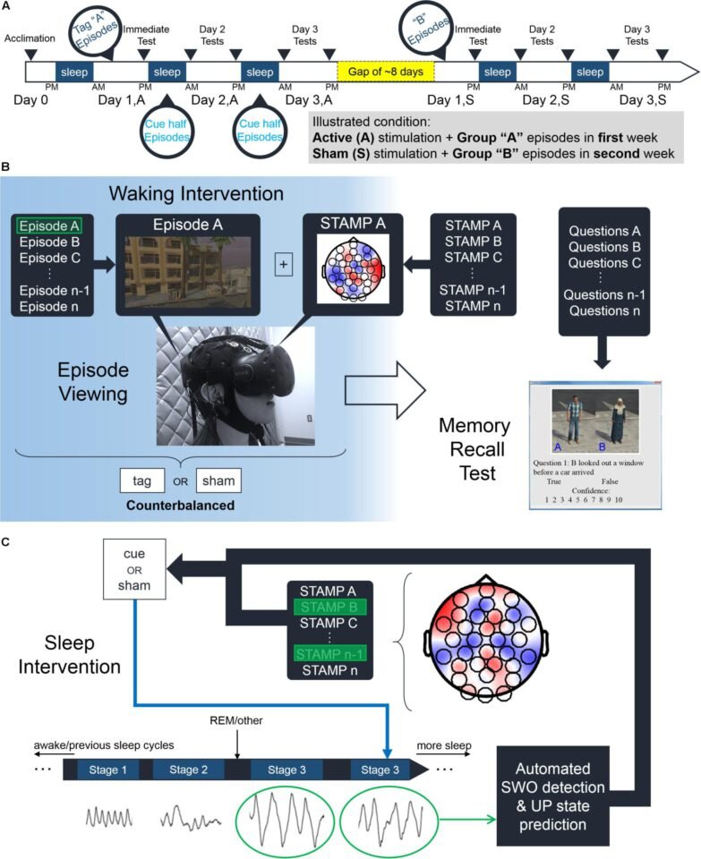 Исследователи HRL Laboratories опубликовали результаты, показывающие, что направленная транскраниальная электростимуляция во время медленного сна может улучшить метапамять определенных эпизодов почти на 20 процентов после лишь однократного просмотра целевого эпизода по сравнению с контрольной группой. Подробнее об их работе читайте в журнале Frontiers in Neuroscience. Схема эксперимента. Credit: Praveen K. Pilly et al. / Frontiers in Neurosciense 2020. Метапамять – это функция, которая описывает чувствительность того, насколько точно воспроизводятся воспоминания, например, во время дачи свидетельских показаний. Другими словами, если точность воспоминания пропорциональна уверенности, с которой человек рассказывает о нем, то это свидетельствует о высоком уровне метапамяти. Уникальные паттерны (режимы) транскраниальной электростимуляции, применяемой во время медленноволновой фазы сна, могут ускорить консолидацию (перезапись) новых воспоминаний в из кратковременной памяти в долговременную