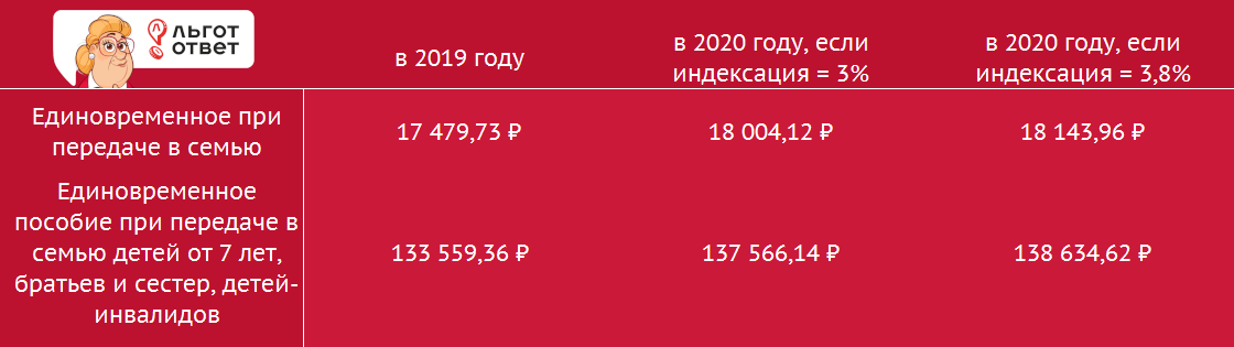 Пособия для опекунов, усыновителей и приемных родителей Российским законодательством предусмотрены выплаты для граждан, который принимают в семью неродных детей. Получить деньги могут: Законодательство разграничивает понятия опекунства, попечительства, приемной семьи и усыновления: Федеральный закон №81-ФЗ предусматривает единовременное при передаче ребенка в семью на воспитание. Его размер зависит от нескольких условий: Вышеуказанные размеры пособий установлены на 1 февраля 2019 года. 1 февраля 2020 года пособия проиндексируют на значение инфляции за 2019, которая по разным предположениям составит либо 3%, либо 3,8%. Усыновители имеют право на материнский капитал, если усыновленный ребенок — второй в семье. В 2019 году его размер — 453 026 рублей, в 2020 — 466 617 рублей. Таким образом усыновители могут рассчитывать на выплаты общей суммой в 586585,36 рублей — 133 559,36 рублей, если они усыновят ребенка старше 7 лет или ребенка-инвалида и материнский капитал в размере 453 026 рубл