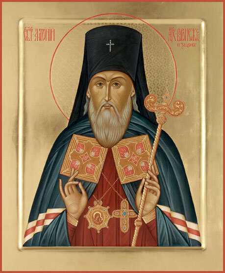 От ю́ности твоея́ всего́ себе́ Го́сподеви преда́л еси́, в пеще́рах Ки́евских богому́дренно пребыва́я, и отту́ду во епи́скопа па́стве Воро́нежстей поста́вленный, святи́телю Христо́в Анто́ние всече́стне, в труде́х, бде́ниих и моли́твах до́бле подвиза́лся еси́, и та́ко во смире́нии дости́г доброде́телей соверше́нства и Це́ркви Святе́й и́стиннаго послуша́ния, па́ки в Небе́сныя Оби́тели всели́лся еси́, с вели́кими во святы́х Митрофа́ном и Ти́хоном, предстоя́ Престо́лу Христо́ву, Влады́ку Спа́са все́х моли́, оставле́ние грехо́в получи́ти и ве́лию ми́лость.