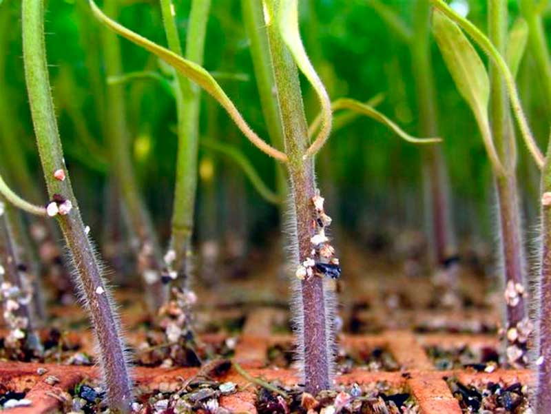 В чем причина гибели рассады томатов? Почему всходы полегли через месяц после посева? К полеганию, выпадам и гибели рассады чаще всего приводит черная ножка, или гниль корневой шейки сеянцев. Это опасное грибное заболевание пасленовых. Корневая шейка чернеет, утончается, а потом загнивает. Страдает от черной ножки, в основном, молодая рассада. Заболевание вызывают почвенные грибы. Способствуют распространению черной ножки также плохая освещенность, высокая кислотность почвы, слишком частые поливы, загущенность посадок, перепады температуры. Самый действенный способ не допустить к растениям черную ножку – профилактика. Нужно покупать качественный посадочный материал, особое внимание уделяя устойчивым к черной ножке сортам и гибридам. Почву перед высадкой рассады нужно прогреть в духовке при 100°С в течение получаса. Эффективна заблаговременная обработка почвы биопрепаратами. И, конечно, очень важно соблюдать оптимальный для томатов режим выращивания: температура 23–25°С, редкие