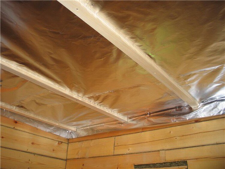 Теплоизоляции потолков бани надо уделить особое внимание. Если потолочное перекрытие планируется сделать полностью деревянным, следует поверх чернового потолка уложить слой стеклоткани и залить глиняно-песчаным раствором, смешанным в пропорции 1:1 с опилками или половой (мелкой рубленой соломой) слоем толщиной 20—30 см. После высыхания первого слоя заливается второй — 1 часть глиняно-песчаного раствора и 3 части вермикулита, толщиной до 50 мм. После высыхания второго слоя (от двух недель до двух месяцев в зависимости от погодных условий) на него укладывают слой пенопласта толщиной 100—150 мм, а поверх пенопласта заливают слой цементного раствора, смешанного с пенопластовой крошкой в пропорции 1:3. Если над баней планируется мансардное помещение, необходимо поверх последнего слоя теплоизоляции застелить слой рубероида или толя и настелить деревянный пол. В нижней части потолка под черновой доской необходимо закрепить рейки обрешетки с промежутком 500 мм. Между ними сначала за