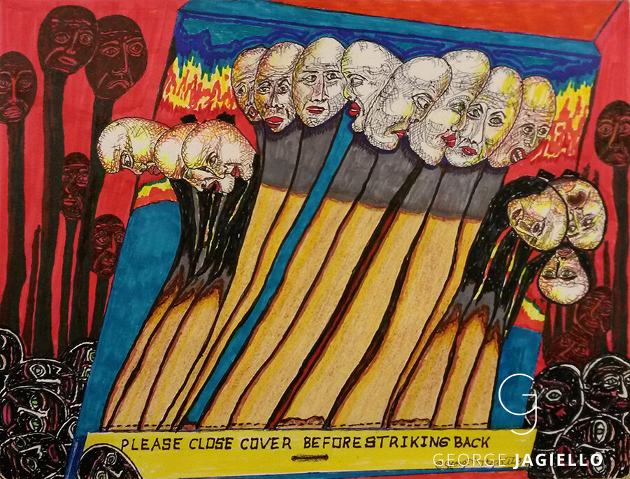 Джордж Ягайло - художник- самоучка из США, штат Массачусетс. Он начал заниматься творчеством еще в раннем возрасте, создавая свои картины из всего, что попадалось под руку. Джордж не только рисует, он еще занимается резьбой по дереву, обрабатывает камни, делает коллажи, создает гравюры на стекле. Всю свою жизнь он посвятил творчеству и в 27 лет стал владельцем собственного магазина художественных принадлежностей. Когда у Джорджа появилась семья и дети он постарался передать любовь к искусству и им. Но это у него не особенно получилось. Поэтому он полностью сосредоточился на самореализации. Огород, семья, рыбалка и... безумные картины После выхода на пенсию Джордж стал посвящать творчеству все свое время – он занимается рисованием, черчением, пишет стихи. В 2007 году его жена Фреди посоветовала своему мужу продать работы на одном из популярных аукционов и, к удивлению художника, его картины очень быстро раскупили. Конечно, можно поспорить на тему ценности и значимости этих доволь