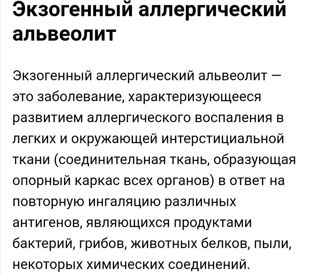 У меня экзогенный аллергический альвеолит. Очень тяжело дышать, одышка и в покое и в движение, усталость постоянная, и это в 35 лет. Вроде есть положительная динамика при лечение преднизолоном, а дышать немогу. Из за приёма таблеток у меня сильная тахикардия, видимо это и есть причина одышки 😣. Работать немогу сейчас, начальство требует чтоб я написала заявление на увольнение, но я работала с опасной химией, и скорее всего там это и заработала. 😏Дорогие друзья, если кто тоже болеет данной болезнью, откликнитесь. Очень хочется победить эту болезнь, и пожить ещё немного!