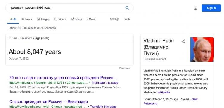 Пользователи соцсетей случайно узнали от Google о будущем президента России и испугались не на шутку. Из-за нелепого бага всё выглядит так, будто Путин будет править страной дольше, чем кто-либо ожидал. Ну, или алгоритмы поиска подозревают насчёт Владимира Владимировича что-то, что простым смертным знать не положено. В субботу, 11 января, пользователь твиттера Евгений Гинден открыл для себя неожиданную особенность поисковых алгоритмов Google и не только породил множество шуток про бессмертного Владимира Путина, но и сделал поисковый запрос о нём одним из самых популярных вообще. Мужчина опубликовал твит о своём открытии, не на шутку заинтриговав подписчиков: Прямо сейчас зайдите в Google и впишите в поиск: «Президент России 9999 года». Выглядит пугающе смешно. Вот, что поисковая система выдаёт в ответ на такой запрос: Разумеется, мнимое бессмертие (ну, или особенно выдающееся долголетие) президента стало поводом для шуток. Впрочем, вскоре комментаторы выяснили: Goo