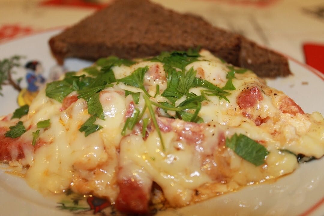Вам понадобится: яйцо-4шт помидор-1шт болгарский перец-1шт сосиски-4шт сыр плавленный-1уп. соль,перец, приправы по вкусу ПРИГОТОВЛЕНИЕ: Нарезаем полукольцами перец и помидоры, сначала отправляем на сковородку помидоры, обжариваем две-три минуты и туда же добавляем перец, затем нарезаем сосиски вдоль и отправляем туда же парим, жарим минут 5-7 перемешивая , затем отправляем туда яйца ждём две минуты, затем открываем крышку выкладываем сыр, солим перчим, накрываем крышкой ждём ещё 2 минуты, затем наслаждаемся сочным, безумно вкусным и сытным завтраком 😏👍🏻 👍🏻👍🏻👍🏻