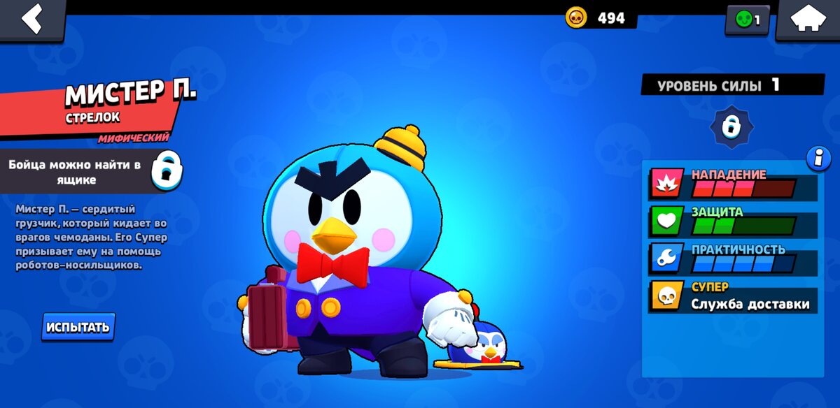 Всем привет. Недавно в Brawl Stars добавили нового героя. Его зовут Мистер П. Он выглидит как пингвин. Это мифический гарой из класса стрелок. Его ульта заключается в том что он ставит турель и из неё выходит маленький пингвинчик которой убивает врага. Подобный обзор на моём конале в ютубе:https://www.youtube.com/channel/UCaxUVug73PtCvUEJM8wTEdg И в тик токе: user0gl7xzdxqs