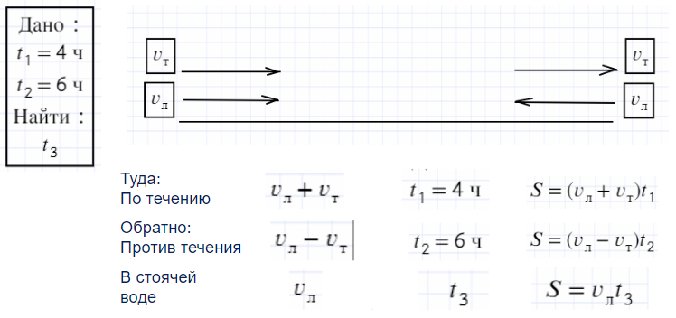 (задание 11 профильного ЕГЭ) Условие задачи Моторная лодка, двигаясь по течению реки, преодолевает путь от деревни А до деревни В за 4 часа. Обратный путь из В в А та же лодка проплывает за 6 часов. Найдите, сколько времени потребуется этой лодке, чтобы проплыть такой же путь в стоячей воде. Анализ условия Запишем "Дано" (как в задаче по физике), сделаем чертеж и заполним табличку. Решение задачи в общем виде (алгоритм) Зачем решать в общем виде? Проще сразу подставить числа. Но решение в общем виде позволяет потом применить его для любой аналогичной задачи. Таким образом, мы получаем алгоритм решения. В этом состоит физический подход к решению текстовых задач по математике. И не только задач на движение (об этом - в следующих статьях). В приведенном ниже на рисунке решении алгоритм следующий: 1. Записываем путь лодки тремя уравнениями (для движения по течению, против течения и в стоячей воде). 2. Приравниваем первые два выражения. 3. Заметим, что в нашей системе уравнений неизве