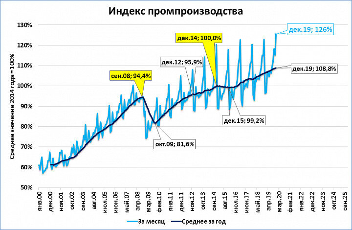 В декабре 2019 года промпроизводство в России достигло 126% от среднего уровня 2014 года и стало лучшим за всю постсоветскую историю. График 1. Также рекордным стал и годовой объём, отображаемый синей линией на графике 1. Но новые рекорды устанавливаются достаточно часто в последнее время, ведь синяя линия (отображающая промпроизводство за последние 12 месяцев) неуклонно ползёт вверх. Но важен те только рост, но и его темпы (график 2). Пессимисты могут разглядеть нисходящий тренд (коридор, выделенный красными пунктирными линиями). Оптимисты могут нарисовать восходящий тренд (коридор, выделенный зелёными пунктирными линиями). Наша оценка: всё это «буря в стакане воды». Темпы низки по сравнению с темпами, соответствующими хорошему росту ВВП (см. чёрные пунктирные линии). И такая динамика продолжится, пока остаются низкими темпы роста реальной денежной массы, а значит и темпы ВВП. В заключение отметим, что если ВВП России превзошёл советские максимумы, то промышленное производство и инв