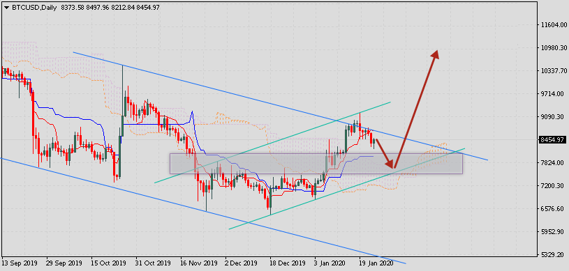 Курс Bitcoin прогноз на неделю 27 — 31 января 2020 Криптовалюта Bitcoin завершает торговую неделю вблизи области 8454. Котировки BTC/USD торгуются выше верхней границы Облака Ichimoku Kinko Hyo. Это указывает на среднесрочной бычьей тенденции по Bitcoin. В рамках прогноза курса криптовалюты на неделю 27 — 31 января 2020. Ожидается развитие нисходящей коррекции и тест верхней границы Облака Ichimoku Kinko Hyo вблизи 7865. Откуда стоит ожидать попытку отскока и продолжения роста курса Биткоин с целью выше уровня 11025. Курс Bitcoin прогноз на неделю 27 — 31 января 2020 Дополнительным сигналом в пользу роста ведущего цифрового актива на текущей торговой неделе выступит тест уровня поддержки. Вторым сигналом станет отскок от нижней границы восходящего канала. Ранее был получен слабый сигнал для покупок криптовалюты Bitcoin. Сигнал сформировался за счет пересечения сигнальных линий на уровне 9155. Ближайшая область сопротивления располагается на уровне 9805. Области поддержки по Bitcoin р
