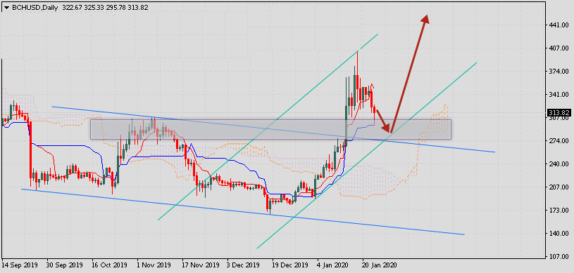 Bitcoin Cash прогноз курса на неделю 27 — 31 января 2020 Криптовалюта Bitcoin Cash завершает торговую неделю вблизи области 345.69 и торгуется в рамках сильного роста. Котировки BCH/USD движутся выше верхней границы Облака Ichimoku Kinko Hyo. Это указывает на наличие бычьей тенденции по Bitcoin Cash. На текущей торговой неделе 27 — 31 января 2020 ожидается развитие коррекции и тест сигнальных линий индикатора Ichimoku Kinko Hyo вблизи 280.05. Откуда стоит ожидать попытку отскока и продолжения развития роста с целью выше уровня 450.05. Bitcoin Cash прогноз курса на неделю 27 — 31 января 2020 Дополнительным сигналом в пользу роста криптовалюты BCH/USD выступит тест уровня поддержки. Вторым сигналом станет отскок от верхней границы нисходящего канала. Ранее был получен слабый сигнал для покупок криптовалюты Bitcoin Cash, за счет пересечения сигнальных линий на уровне 190.05. Отменой варианта подъёма котировок BCH/USD станет пробой нижней границы Облака индикатора и закрытие ниже уро