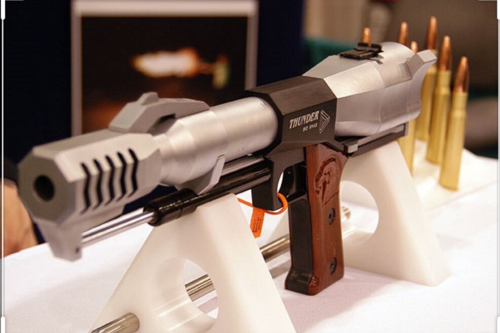 1. Пистолет Thunder 50 BMG Если начнется война с роботами, эта вещь будет кстати. Или, допустим, если у тебя нет перфоратора, а надо срочно сделать дырку в стене, этот пистолет тоже вполне подойдет. Однозарядный пистолет Thunder 50 BMG был впервые показан на международной выставке Shot Snow в Лас-Вегасе в 2004 году. В пистолете используются дульный тормоз и редчайшая гидравлическая система отката ствола. 2. Револьвер Pfeifer Zeliska в калибре 600 Nitro Express В 1995 году австрийский оружейник и любитель пострелять из мощных револьверов Адольф Целиска решил создать мощнейший револьвер. Поэкспериментировав с зарядами, он обратился в компанию Pfeifer. 3. Револьвер Smith and Wesson Magnum-500 Если ты купил арбуз и тебе надо его разделить на несколько частей, этот револьвер будет как нельзя кстати. Правда, тебе потом придется собирать эти части со стен. В январе 2003 года компания Smith and Wesson представила публике свой новый револьвер под мощнейший патрон 500 SW Magnum.