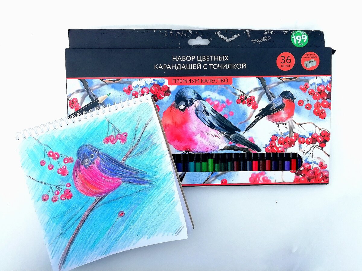 Не умею рисовать карандашами.. Но теперь есть все шансы научиться) Помню как муж принёс мне в подарок акварель "Белые ночи", а потом всё спрашивал почему я не рисую ей. Сложно было ему объяснить, что используя дорогие материалы, я не стану рисовать лучше, что сначала нужно набить руку, отработать технику. И какое-то время я ждала того момента, когда же заслужу "Белые ночи", не хотелось тратить добро на овно) Так же и с карандашами. Некоторое время я приглядывалась в магазинах к карандашам, хотелось взять побольше цветов и подешевле. Неожиданно на помощь пришёл "Fix Price". Там я увидела коробку : 36 цветов за 199 рублей. Жмот в моём сердце говорил, что надо брать, а разум говорил, что они могут оказаться ужасно твёрдые и рисовать ими будет невозможно. Жмот победил. К моему удивлению карандаши оказались нормальные. Из минусов: пока не почиркаешь на листе - не поймёшь какой цвет как рисует; несколько раз я была очень удивлена, поскольку обозначение цвета на карандашах не всегда совпа