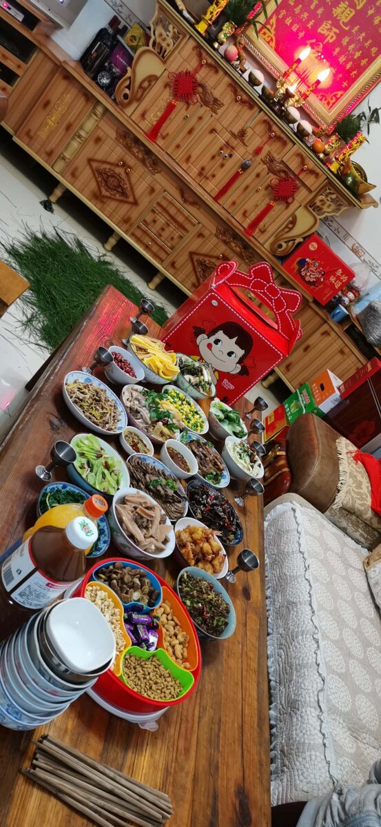 В принципе, едят все те же блюда, что и всегда. Единственная разница в том, что в новогоднюю ночь еды на столе должно быть много. Конкретные блюда будут тоже отличаться: в зависимости от распространённой в данной провинции кухни, города и вкусов каждой семьи. Общее место: на столе должна быть рыба. Целая. Символ благополучия и богатства. Также многие ставят на стол лапшу - символ долголетия. В остальном - вариаций сотни. Но каждое блюдо имеет символическое значение. Чаще всего, это символы богатства, долголетия, удачи, денег, благополучия, здоровья, плодородия и тому подобные. В принципе, очень грубо обобщая, все символы можно объединить в 2 группы: богатство и удача (деньги/финансовое/материальное благополучие, достижение поставленных целей, карьерный рост, успешная учеба), здоровье и долголетие (туда же плодородие, то есть пожелание иметь много детей). В качестве иллюстрации выбрала фотографии столов не только в богатых семьях, но и в бедных. Но могу сказать, что разницы практиче