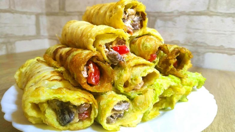 Помидоры черри – 5-6 шт. Зелень, чеснок – по желанию и вкусу Растительное масло для жарки Способ приготовления 1. Начинка. Шампиньоны нарезать на небольшие кусочки. Обжарить с луком и специями на растительном масле. 2. Помидоры нарезать на небольшие кусочки. Твердый сыр натереть на мелкую терку. Смешать ингредиенты. Заправить сметаной. Для пикантности можно еще добавить любимую зелень и пару зубчиков чеснока. 3. У капусты отрезать жесткую часть. Разобрать на листы. У листов отбить плотную часть с двух сторон. 4. В отдельную емкость разбить яйца, посолить и поперчить, взболтать вилкой. 5. Обмакнуть лист в яйца и обжарить с двух сторон на сковороде с растительным маслом. Таким образом обжарить все листы капусты. 6. На край листа кладу начинку и сворачиваю в плотный рул