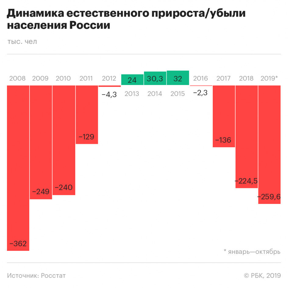 Так, если в 2017 году естественная убыль населения составила 135,7 тыс. человек, в 2018-м – 224,6 тыс., а за 10 месяцев минувшего года был вообще установлен «рекорд» за последние 11 лет – 259,6 тыс. человек.