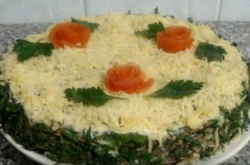 4. Сложите торт, промазывая поочерёдно все коржи, включая верхний. На мелкой стороне тёрке натрите сыр и посыпьте сверху. Петрушку и укроп вымойте, обсушите и нарежьте (несколько листочков петрушки оставьте для украшения). Украсьте рубленой зеленью бока – присыпьте и слегка прижмите руками. Нарежьте помидоры на тонкие полудольки, соорудите из этих «лепестков» розочки и украсьте торт. Рядом с цветами положите листики петрушки.