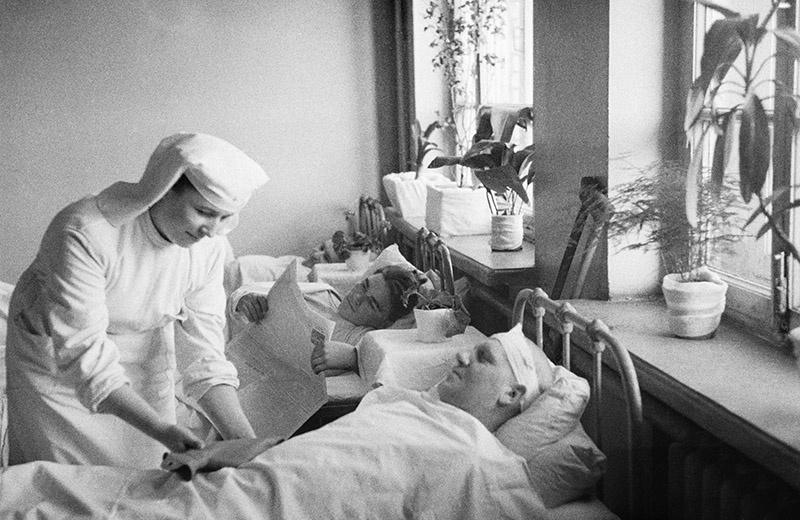 Я очнулся, когда меня проносили через распахнутые двери. Еще не поняв, где нахожусь, я заметил над дверью разбитую табличку: «6-й кла…». Стало ясно: госпитальная палата размещалась в одном из классов школы. Узкая железная койка жалобно скрипнула. Ногу в гипсе я положил поверх одеяла. - Лежи,- доброжелательно пробасил усатый санитар и, окинув взглядом класс, добавил: - Лежи, ученик… Ответной улыбки не получилось. От резкой боли скривились губы. Усач понимающе кивнул головой и скрылся за дверью. Мысли путались, хотелось спать. Когда проснулся, боль немного приутихла. Лежал и наслаждался тишиной и покоем. Уловил приятный запах. «Откуда?» Я открыл глаза. Высокая девушка с перехваченной широким ремнем талией тихо, видимо, боясь разбудить меня, разговаривала с моим соседом. « Надушилась», - я внимательно посмотрел на девушку. Из под белой с красным крестом косынки выбивалась русая прядь волос. Заметив, что я проснулся, девушка повернулась и, словно давнишнему знакомому, сказала: - Надо п