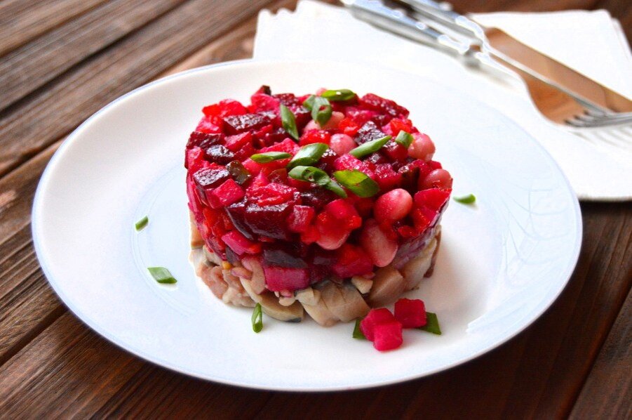 Ингредиенты: 4 порции 45 минут Морковь и картофель отварите и нарежьте кубиками. Свеклу отварите отдельно и нарежьте кубиками.Лук измельчите.Селедку нарежьте ломтиками.Все перемешайте,посолите,поперчите и заправьте растительным маслом.