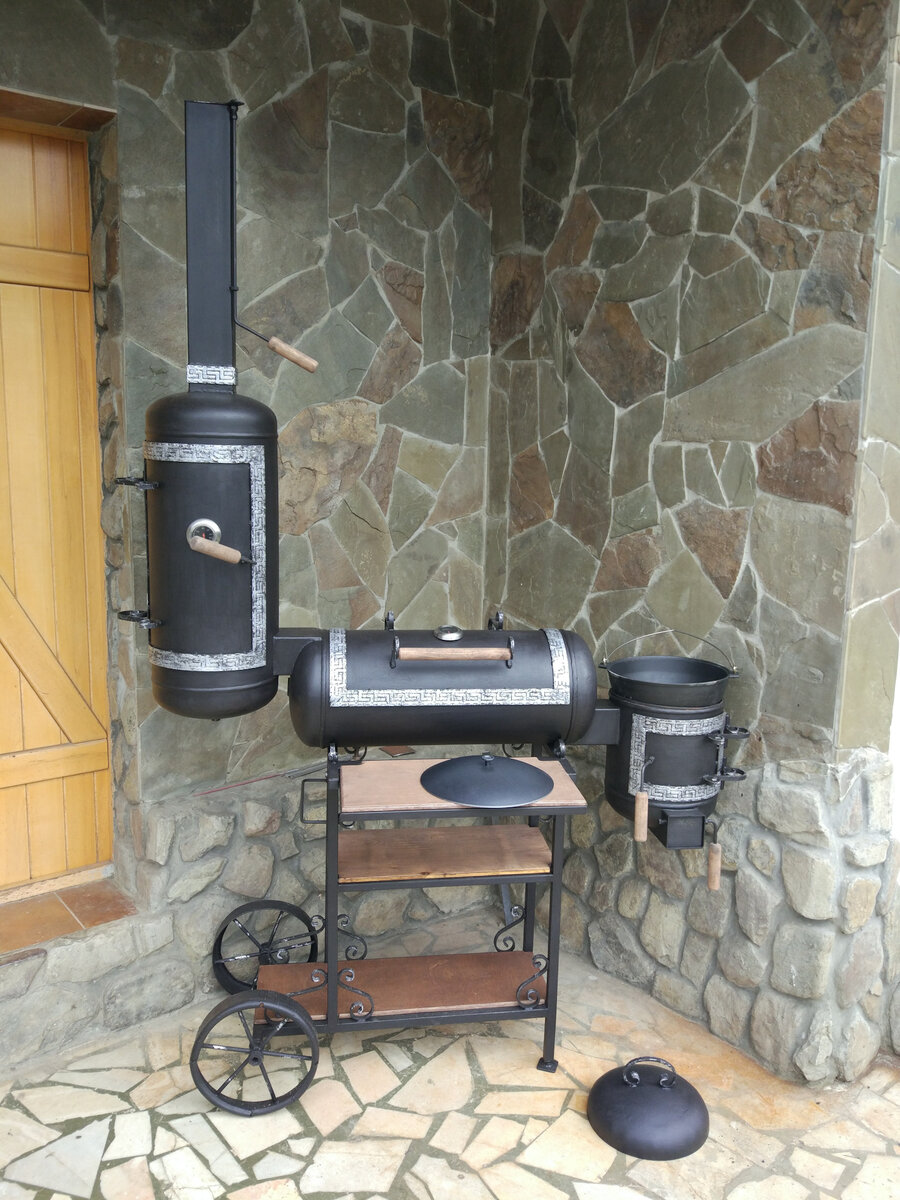 Имелось два ненужных 50л и один 27л газовых баллона и желание сделать нормальный мангал к сезону.Металл на баллонах толщиной 3 мм диаметр 300 мм, чего вполне достаточно.Вот результат Идея с интернета, конструкций множество, как и внешнего оформления.Для начала нужно удалить вентили с баллонов.Я это сделал достаточно легко с помощью 2 газовых ключей, были 3 и 4.Одним фиксировал горловину прижимая ногой к земле, другим крутил.Рожковым ключем думаю не стоит и пробовать — потеря времени.Перед этим стравил остатки газа.Выкрутив вентили тщательно промыть баллоны от конденсата лучше несколько раз заполняя водой и сливая ( по возможности дальше от дом а и соседей -очень вонюче и держится лучше французских духов)Заполненные водой баллоны закрыть вентилями и можно резать.Для разметки использовать заводской шов., отметив середину на другой стороне отступить внутрь 5-8 см ( крышка должна быть меньше половины баллона.Прорезав баллон со стороны петель приварить их, иначе потом будут сложности с этим