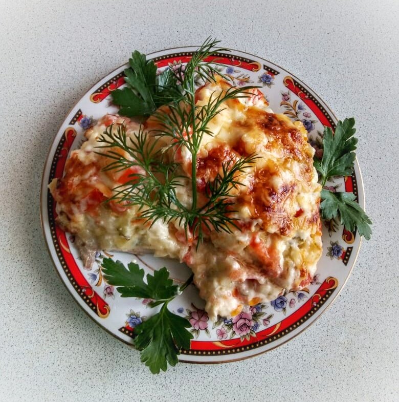 Предлагаю очень вкусное запеченное мясо. Всем мужчинам очень нравится это блюдо. Оно так и называется для любимого. Приготовьте для своих мужчин такое мясо, они точно не останутся равнодушными. Давайте готовить. ПРОДУКТЫ: ГОТОВИМ: Мясо моем, обсушиваем и нарезаем пластинами (порционными кусками) примерно один сантиметр высотой. Можно каждый пласт слегка отбить. Картофель чистим и отвариваем до готовности. Остужаем и натираем на крупной терке. Лук шинкуем мелкими кусочками. Помидоры ошпариваем кипятком, и снимаем с них кожицу. Нарезаем пластиками. Огурцы натираем на крупной терке. Сыр натираем на мелкой терке Противень смазываем растительным маслом и выкладываем пласты мяса. На мясо выдавливаем чеснок и посыпаем специями или просто солью по вкусу. Следующий слой будет лук, затем картошка, затем огурцы и последним слоем будут помидорки (они без кожицы, поэтому получаются мягонькими и нежными). Верх смазать майонезом смешанным с сыром. Запекать в духовке минут сорок или пятьдесят, при тем