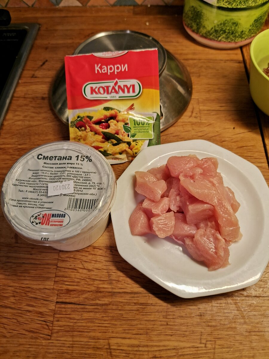 Ужин из курицы карри, для тех кто хочет ощутить вкус Азии. Что нам нужно: 1. Курица- 177г 2. Сметана 15%(для тех кто любит повкуснее, можно заменить сливками, для тех кому нужно убавить калорийность, соответственно на низжий процент или на Йогурт) - 40г, но если хотите больше соуса, то и сметаны тоже побольше 3. Приправа карри-около 2г. Что делаем: На раскаленную сковородку с антипригарным покрытием кидаем курицу, без добавления масла. Солим, перчим, обжариваем до золотистой корочки на сильном огне. Затем убавляем мощность плиты, добавляем сметану, карри и чуть-чуть воды что бы не пригорало. Прикрываем крышкой и оставляем тушиться минут на 15. Готово! Примерная калорийность на порцию: 414ккал. Если наступил ужин, а у вас ещё осталось место под суточное потребление калорий, то можете догнаться бурым рисом, как это сделала я