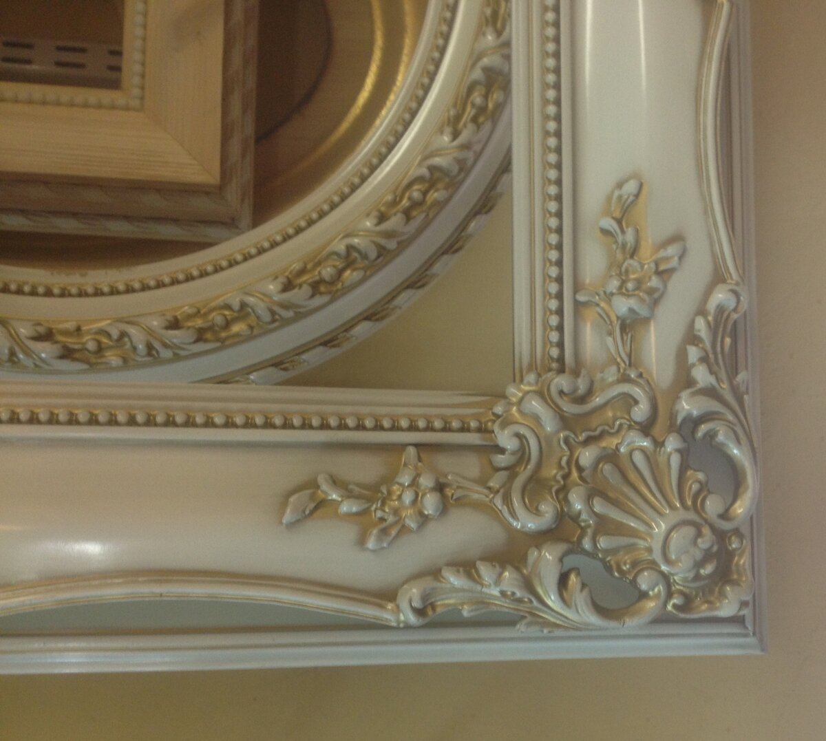 Обычный багет, уголки которого висят во всех багетных магазинах и салонах, выпускается километрами на фабриках. Как правило это сотни вариантов узоров, привязанных к профилям конкретного сечения. Плюс несколько стандартных цветов и способов отделки. Поэтому систематизировать и представить в виде образцов такую продукцию значительно проще. Но с багетными рамами ручной работы ситуация намного сложнее. Во-первых, сами деревянные профили, лежащие в основе такой рамы, могут быть совершенно разными, в том числе и сделанными под конкретный заказ. Можно стыковать несколько профилей в один большой, причем несколькими способами. И даже сам "стандартный" профиль можно по желанию заказчика модернизировать самым разным образом - отрезать лишнее, нарастить рейкой по ширине или высоте, добавить тыльник, фалец и многое другое. Во-вторых, лепной орнамент можно менять практически как угодно. Добавлять розетки только по углам или по центрам тоже. Сдвигать их ближе к центру или за свешивать габарит рамы