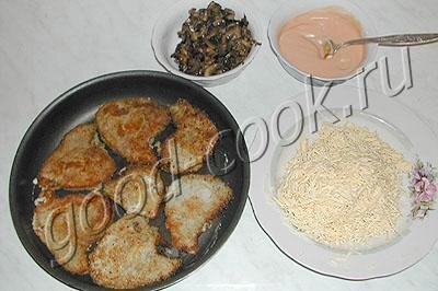 Очень вкусно получилось. И времени на приготовление тратится не много. Вполне можно быстренько приготовить неожиданным гостям (и прослыть замечательной хозяйкой). СОСТАВ 500г мякоти свинины или телятины, 300~500г свежих шампиньонов, 150г сыра, 2~3 ст ложки майонеза или сметаны, 3 ст ложки томатного соуса или кетчупа, 1 яйцо, панировочные сухари, 1 ч ложка соли, 0,5 ч ложки перца Мясо нарезать поперек волокон кусками толщиной 5мм.
