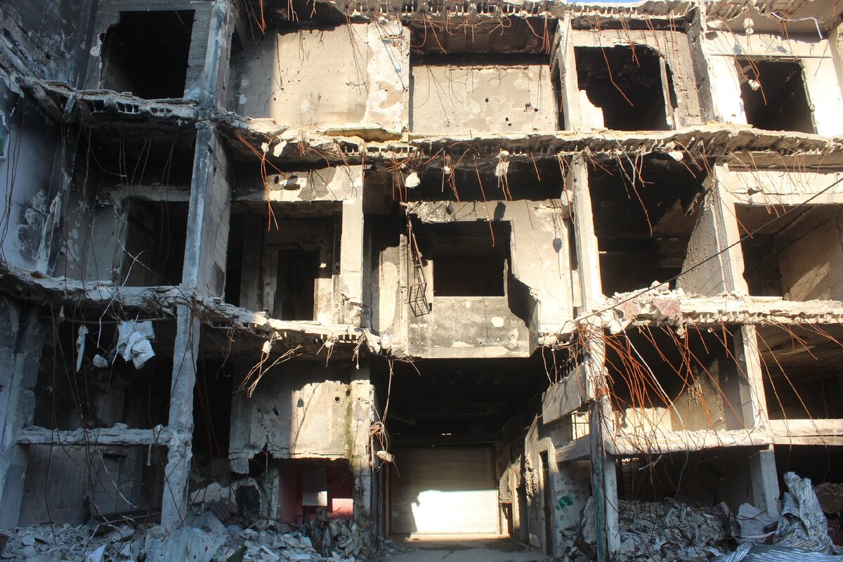 Речь в этой заметке о городе Хомс, серьёзно пострадавшем в ходе боевых действий в Сирии. К счастью, сегодня боевые действия в городе не ведутся и город потихоньку переходит к мирной жизни. На южной окраине города, стоит множество брошенных и недостроенных многоэтажных домов. Я поймал такси и поехал в центр Хомса, к цитадели. Что она из себя представляет, я так и не понял. Вход к ней перекрыли военные. Рядом с цитаделью, я увидел разрушенные в ходе войны жилые дома, а за ними разрушенные жилые кварталы. В городе, местами, шли восстановительные работы. На первых этажах зданий, кое-где работали столярные мастерские и магазины. По улицам бегали дети и играли в футбол. Было спокойно. Я попросил молодых сирийцев сфотографировать меня. Затем я спросил у них, где они живут? Ребята показали мне на разрушенный дом. В нём были одни руины, а повсюду висела железная арматура. Узкие лестницы были завалены мусором, перила были снесены. В стенах пробиты дыры, чтобы можно было передвигаться между дом