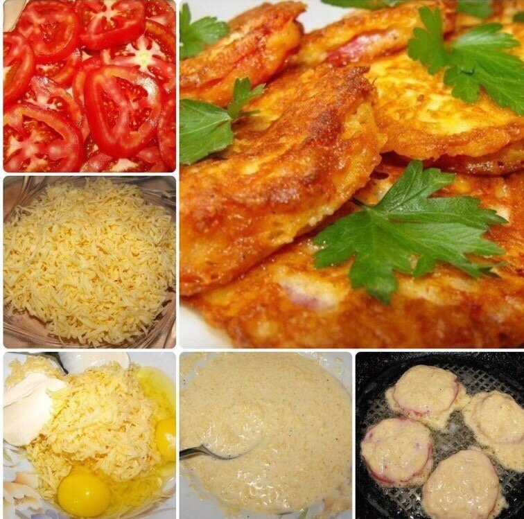 Ингредиенты: 3 средних помидора 150 гр твердого сыра 2 яйца 2 ст.л. майонеза или сметаны 1-2 ст.л. муки соль, перец по вкусу растительное масло для жарки петрушка для украшения Приготовление: 1. Помидоры помыть, обдать кипятком, снять кожицу и нарезать кружочками. Сыр натереть на мелкой терке. 2. Сделать кляр: к сыру добавить яйца, майонез, муку. Посолить, поперчить по вкусу и перемешать. Консистенция дожна получиться густой. 3. Помидоры обмакнуть в кляр, выложить ложкой в сковороду, разогретую с растительным маслом. Обжарить с двух сторон до золотистой корочки. 4. Выложить на бумажное полотенце, дать стечь лишней жидкости. При подаче украсить зеленью петрушки.