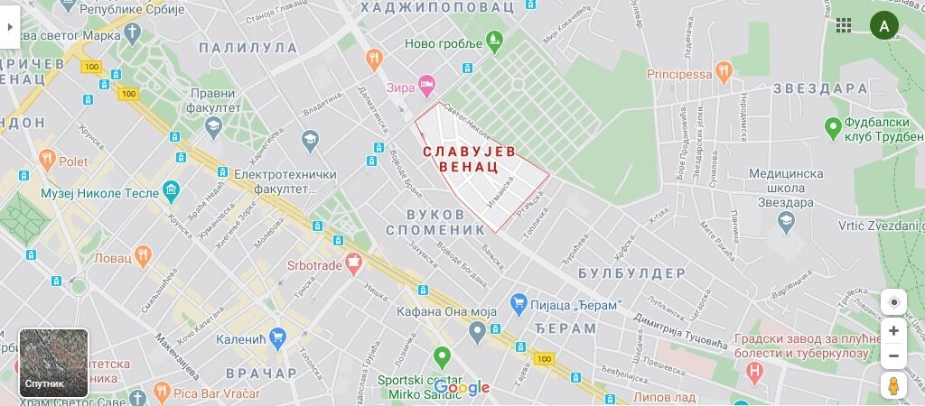 Район Славуев-венац находится в излюбленной мною восточной части центра Белграда. Он как бы зажат между районами Вуков-споменик, Булбулдер и Хаджипоповац, а также между Новым кладбищем: Славуй - это, кстати, тоже "соловей", только уже по-сербски. Раньше здесь протекал Славуев ручей, который теперь заключён в коллектор. Главная достопримечательность Славуев-венаца - итальянское военное кладбище Первой мировой войны, которое граничит с кладбищем Ново-Гробле, или, точнее, является его частью. Вход на кладбище. Не знаю, правда, откуда взялось в Первую мировую войну столько погибших итальянцев в Сербии, что ради них даже сделали специальное кладбище. Возможно, это были пленные с Итальянского фронта, которые умерли на территории Сербии в лагерях или на работах. Где-то на пути к юридическому факультету Белградского университета. Как же много всё-таки в сербской столице старых тачек! И как много исписанных стен: Больше ничего достопримечательного на Славуев-венаце не найти - ни церквей, ни ст