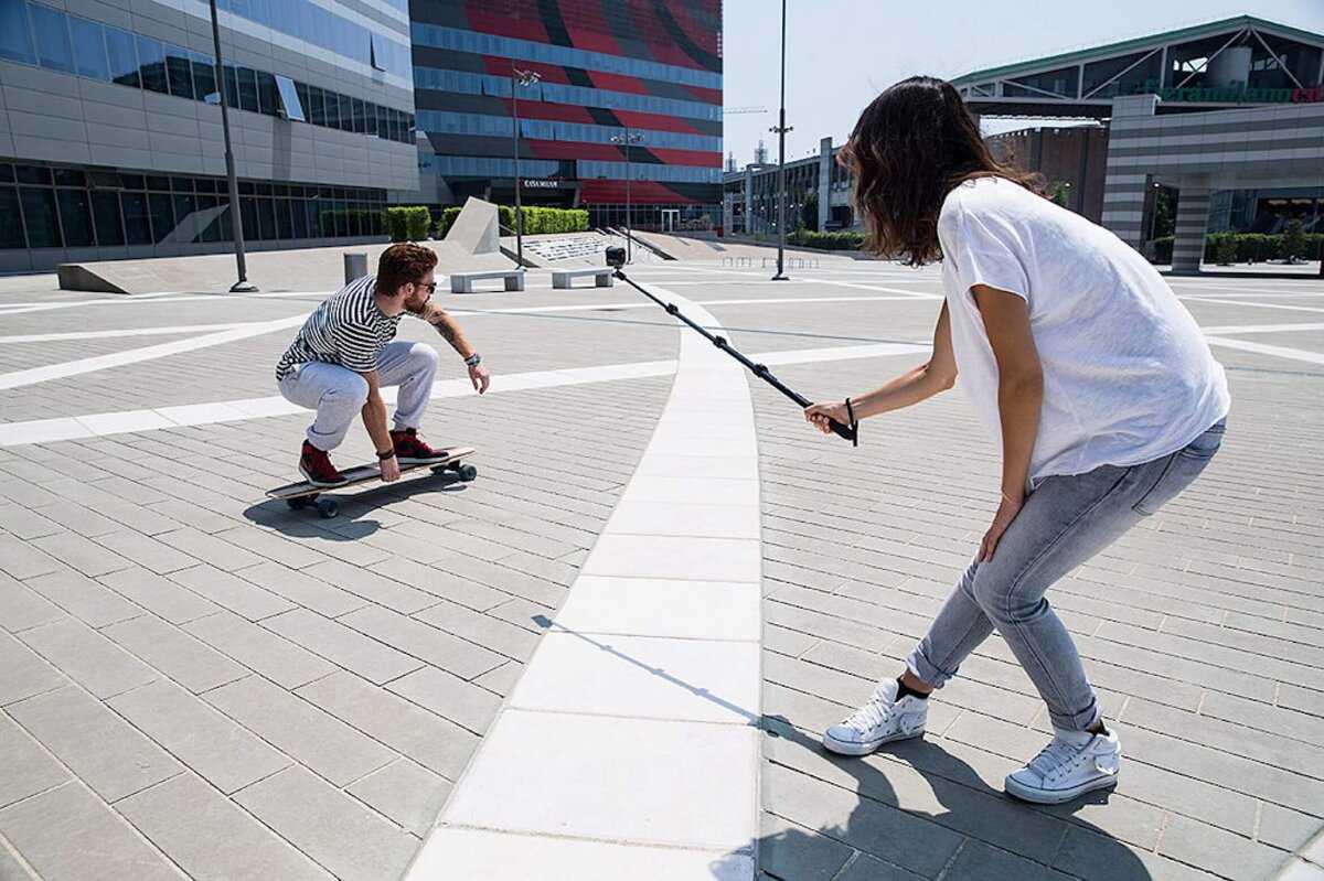 Достаем штатив из коробки и решаем, какая сторона нам нужна в данный момент. Если верхний конец, то получаем селфи-палку. Вешаем туда шарнир или переходник для GoPro и снимаем.