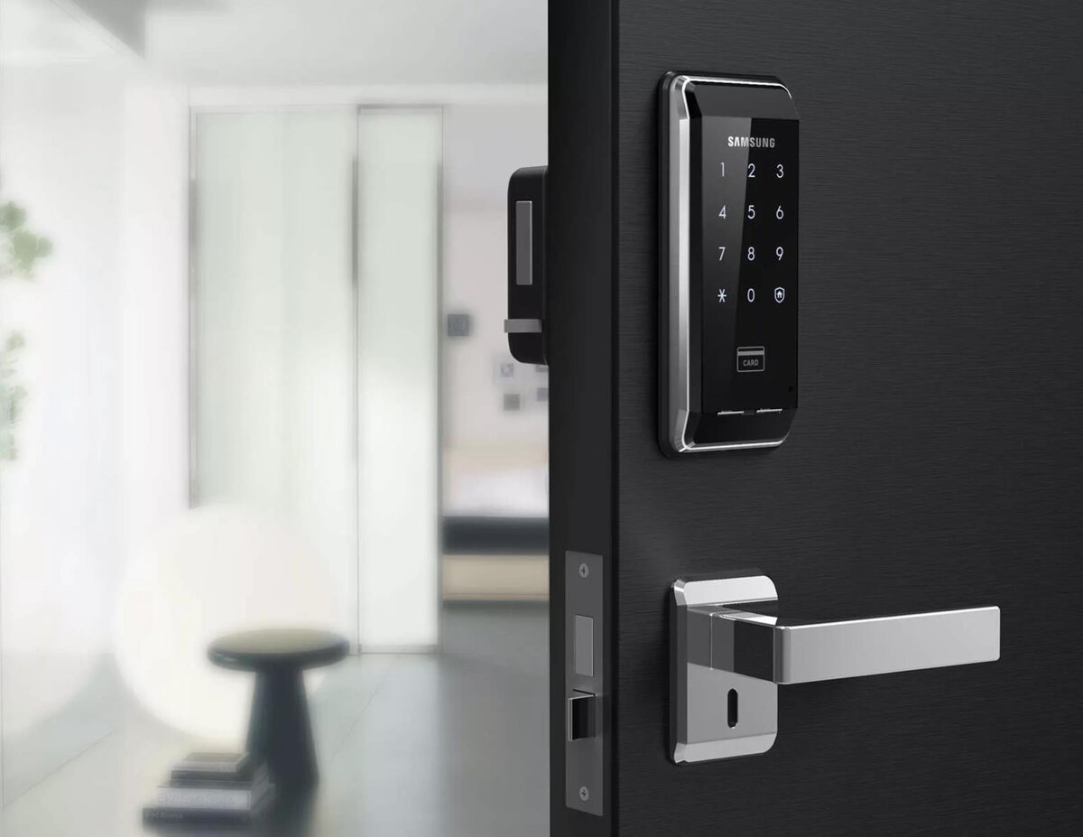 С точки зрения безопасности, электронные запирающие устройства не менее надежны. Вот так внушительно выглядит врезная часть у красивого Samsung с фотографии выше.