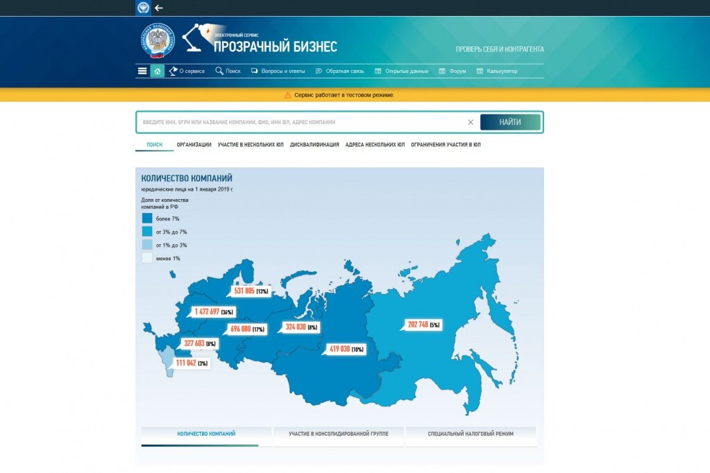 Сервис «Прозрачный бизнес» предоставляет пользователям сводную информацию о компаниях. В неё входят сведения из единого государственного реестра юридических лиц, реестра дисквалифицированных лиц, единого реестра субъектов малого и среднего предпринимательства, государственного реестра аккредитованных филиалов, представительств иностранных юридических лиц и др.