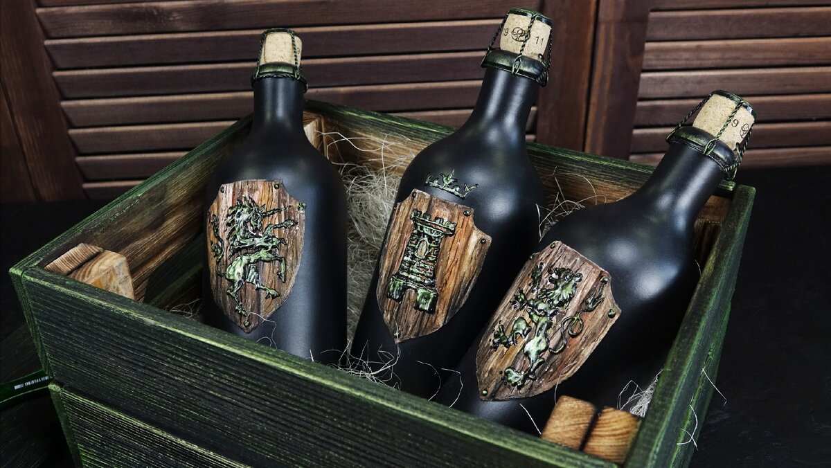 Идея подарка мужчине DIY! Декор набора бутылок: имитация чеканки и геральдики.