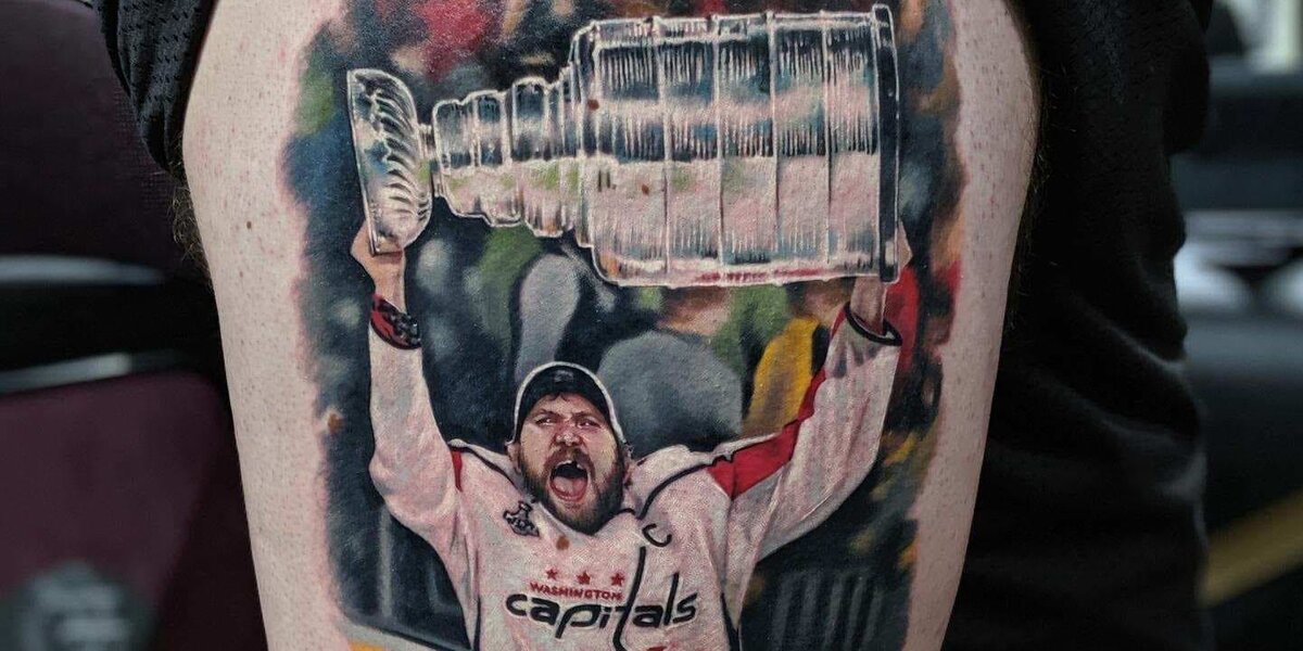 В честь победы "Вашингтона" в Кубке Стэнли Эрик набил себе на ноге татуху с Овечкиным. Получилось красиво.