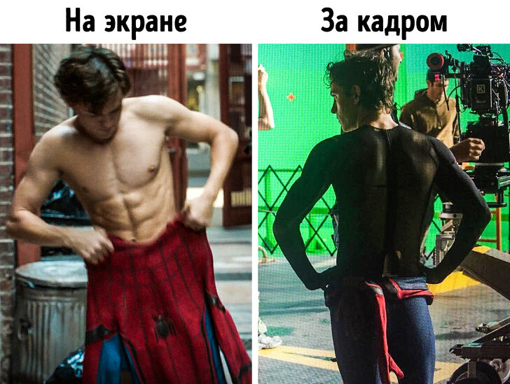 1. В фильмах про Человека-паука есть много сцен, где Питер Паркер легко снимает свой супергеройский костюм, чтобы похвастаться накачанным прессом. Но на самом деле актеру нужно было носить трикотажный костюм, который потом убирали с помощью компьютера, и неудобные стринги под одеждой. 2. Новый облик Криса Хемсворта в финальной части «Мстителей» удивил огромное количество людей. В отличие от коллег по съемочной площадке, чьи костюмы в большей степени были созданы с помощью компьютерной графики, Хемсворт был вынужден носить очень реалистичный накладной живот, который весил около 30 кг. 3. Знаменитый костюм, в котором Человек-паук появляется в фильме в действительности даже не существует, а был полностью нарисован специалистами по визуальным эффектам. Однако журналисты посчитали, что производство такого фантастического костюма в реальной жизни обошлось бы создателям фильма в более чем $ 16 млн. 4. Все самые эмоциональные сцены во время съемок финальной части «Мстителей» за кадром скры