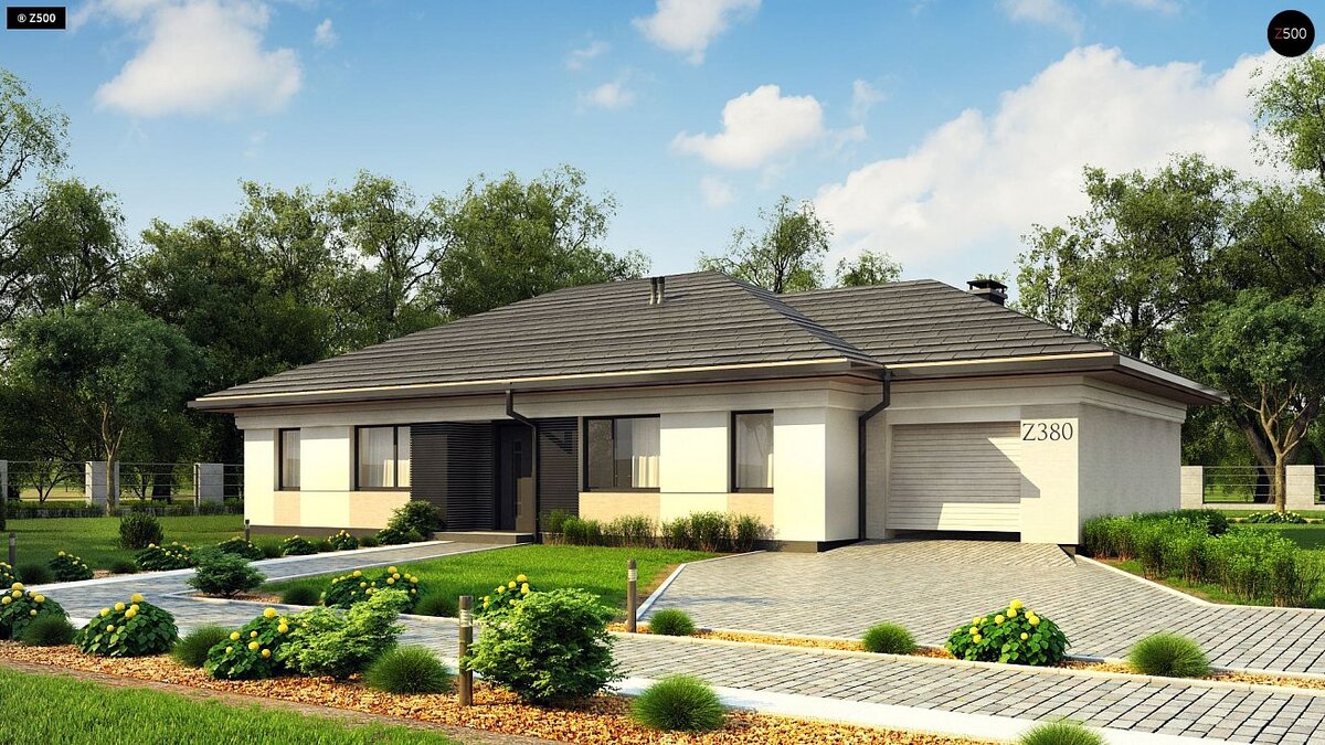 Проект Z380 – это прекрасный одноэтажный дом в современном стиле и гаражом на одну машину. Каталог готовых проектов домов содержит множество вариантов замечательных компактных и комфортных домов, к ним относится и данный проект.