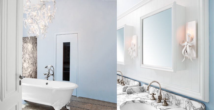 3 — для общего освещения пространства, создания особой атмосферы и реализации дизайнерского решения помещения (при учете, что площадь и высота потолка позволяют) можете смело вешать люстру в ванную комнату. Если она висит на безопасном от воды расстоянии, в помещении работает вентиляция, порадуйте себя желанным светильником в ванной.