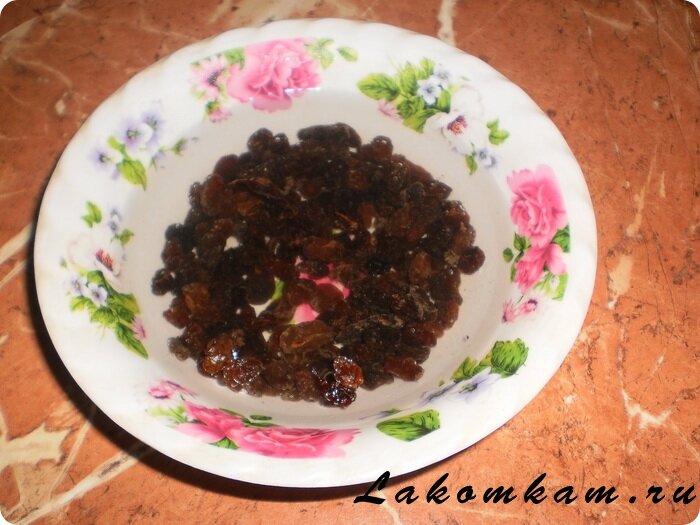 Приготовление кекса с изюмом в мультиварке. Изюм промываем и заливаем крутым кипятком.