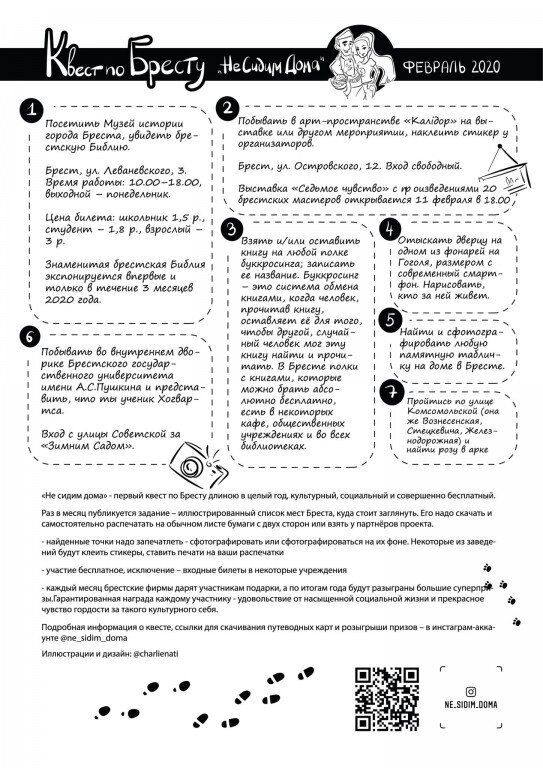 Этот квест позволит брестчанам не только попытать удачу в розыгрыше призов, но и поможет по-новому взглянуть на город, узнать его особенности и побывать на культурных событиях. Подробности – в материале MediaBrest.by. Квест по Бресту «Не сидим дома» разработан владельцами аналогичного говорящего аккаунта в Инстаграм @ne_sidim_doma. Это публичная страница в социальной сети, авторы которой с 2016 года постоянно делятся информацией о новых заведениях в Бресте, интересных событиях и просто подмечают какие-то «интересности» в городе. Сейчас они запустили в городе масштабный квест. Суть его проста. Каждый месяц на странице @ne_sidim_doma будет появляться ссылка в шапке профиля, пройдя по которой можно будет скачать лист с заданиями, которые необходимо выполнить. Участие в квесте бесплатное и без возрастных ограничений. Можно выполнять задания для себя, а можно при этом еще попытать удачу и поучаствовать в розыгрыше призов. Для этого вам надо посетить не менее 80% указанных в листе мест. Н