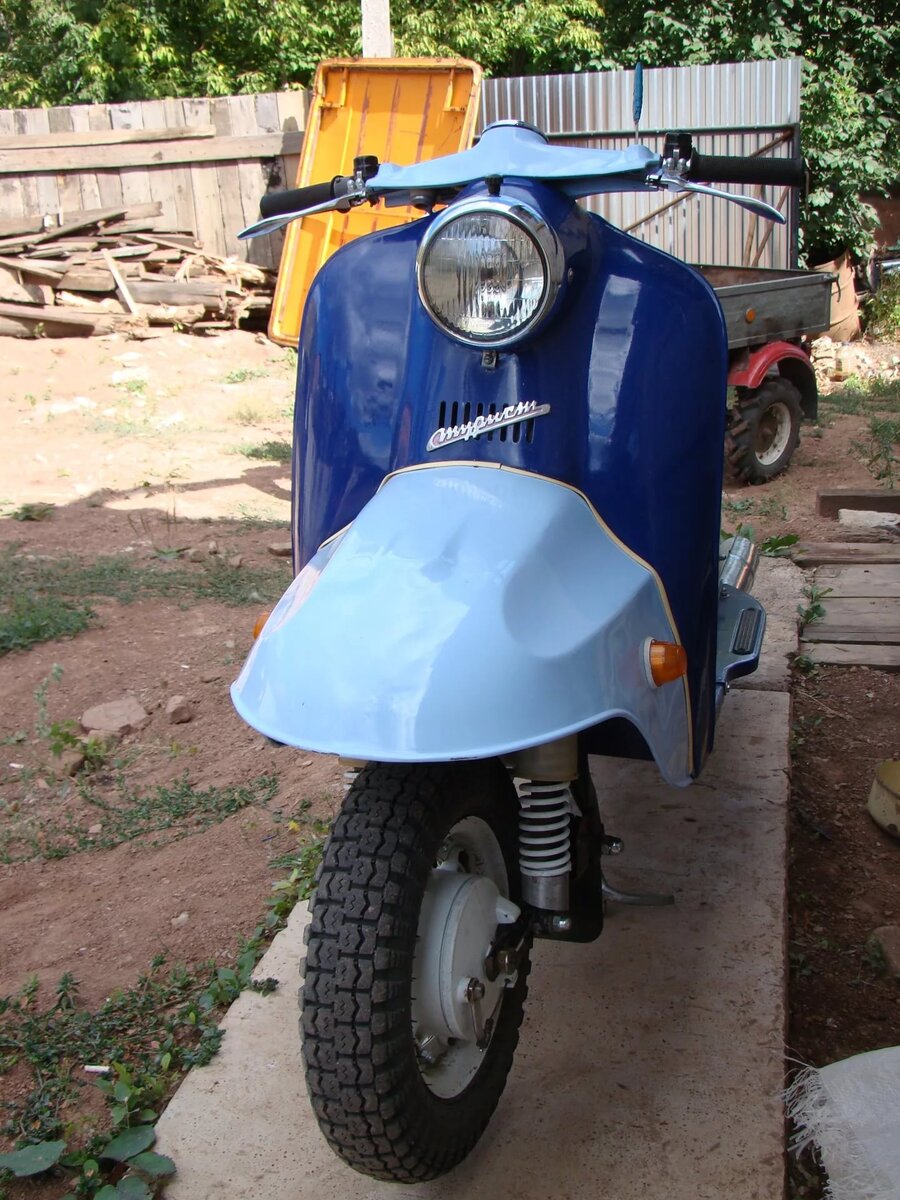 Сегодня на фоне этих воспоминаний захотелось вспомнить очень хороший мотороллер тех лет, Т-200М Турист. Этот вид техники начали выпускать на Тульском машиностроительном заводе с 1968 года. Мотороллер весил всего 145 килограмм и на нем мог ездить в принципе любой желающий, водительское удостоверение на него не требовалось. Двигатель был установлен одноцилиндровый объемом 199 кубических сантиметра, а мощность составляла 11 л.с. Потреблял такой агрегат около 3 литров бензина на 100 километров. В топливный бак заливалась смесь моторного масла и бензина, размер этого бака 12 литров.