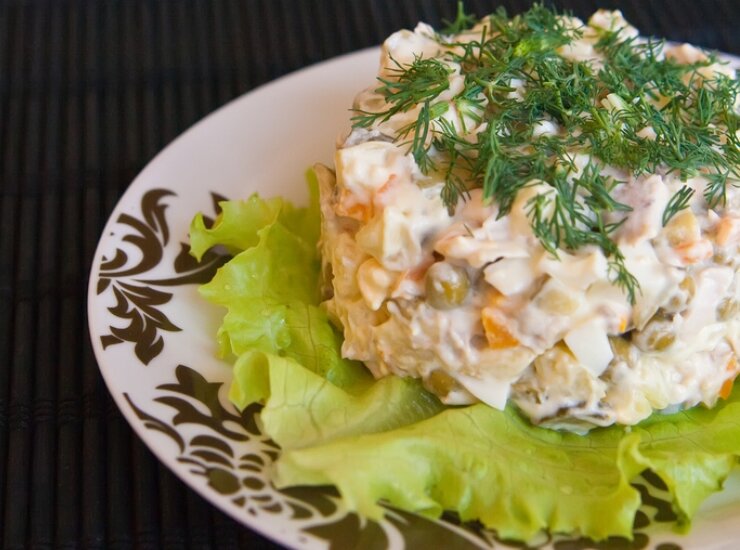 Вместо картошки в этом рецепте используется зеленый салат. Ингредиенты: 12 г молодого свежемороженого зеленого горошка 20 г отварной моркови 30 г зеленого салата «Романо» 50 г свежих огурцов 30 г соленых огурцов без кожи и без семян 1 куриное яйцо 2 перепелиных яйца 10 г каперсов на ножке 30 г домашнего майонеза Перепелка, запеченная на низкой температуре или зажаренная, филе и ножки Как готовить: Приятного аппетита!