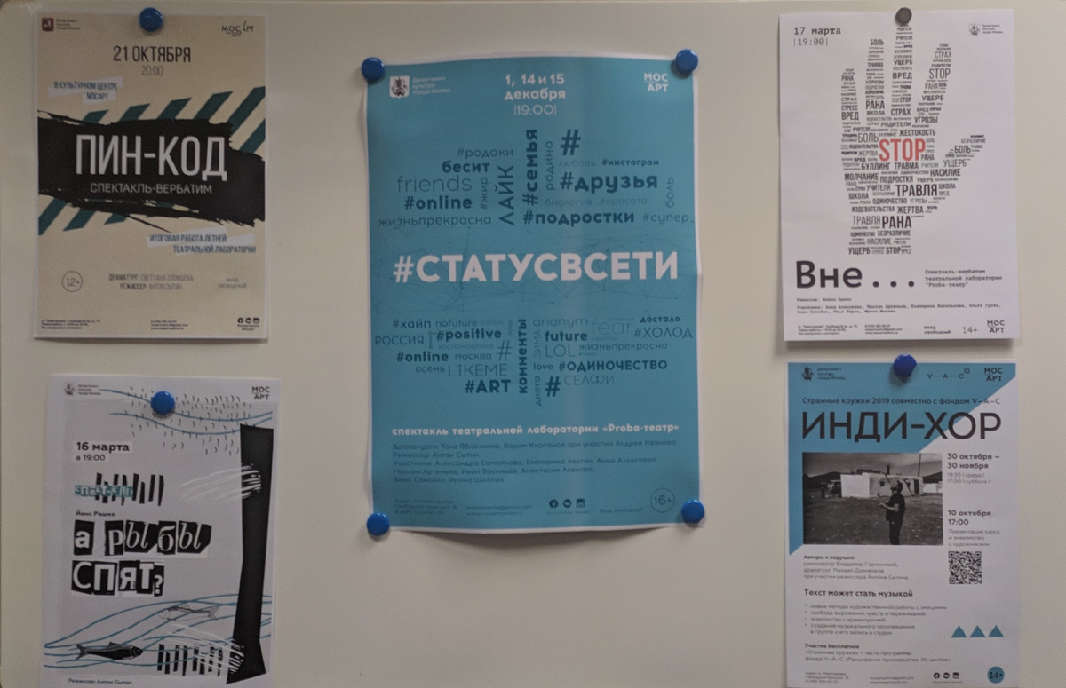 И вот я на площадке, где при входе висят афиши с другими спектаклями студии — «ПИН-код», «А рыбы спят?», «Вне…».