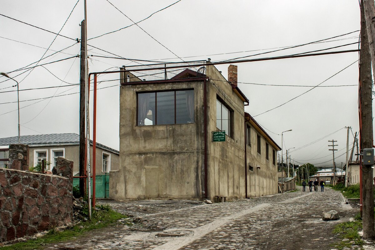 Уже в который раз хвалю себя за то, что не я в нашей семье занимаюсь поиском и бронью отелей по запланированному маршруту. Глупо, конечно, хвалить за неделание чего-то, но, думаю, что я руководствовалась бы больше эстетическими критериями, чтоб все было красиво оформлено, отличалось оригинальным убранством помещений и т. п. Ну и, следовательно, прогадала бы, упустив из внимания невзрачную с виду, с обычными скромными номерами, гостиницу «Веранда» в Степанцминде или в Казбеги, кому как удобно, кто как привык называть. Veranda Guesthouse расположен почти в центре грузинского поселка, ориентир – это ресторан Khevi на площади с памятником Александру Казбеги, расположен всего в 300 метрах от гостевого дома. Встретил нас радушный хозяин Тамаз, показал номер, сделал маленький экскурс по территории гостиницы, а потом проводил в шикарную гостевую комнату с огромным панорамным окном и камином. От «покрепче» мы отказались, а вот кофе в компании Тамаза с удовольствием попили, а заодно и осмотрел