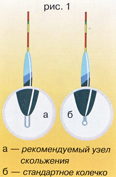 В целом ряде случаев названные качества скользящей конструкции при прочих равных с неподвижной условиях ловли (например, требуемой дальности заброса) позволяют использовать более легкую оснастку, т. е. потенциально более чувствительную, мало-шумную и малозаметную, а следовательно, и более уловистую. Скользящая оснастка вообще более изящна и эстетична; она, наконец, облегчает и ускоряет сбор снасти "по-походному" и приведение ее в готовность на месте ловли, не требуя, в частности, сбивать установленную накануне рыбалки в прикормленной месте величину спуска, а если кого это волнует, затрудняет нежелательным конкурентам определение глубины, на которой вы "нащупали" рыбу.