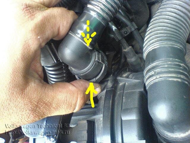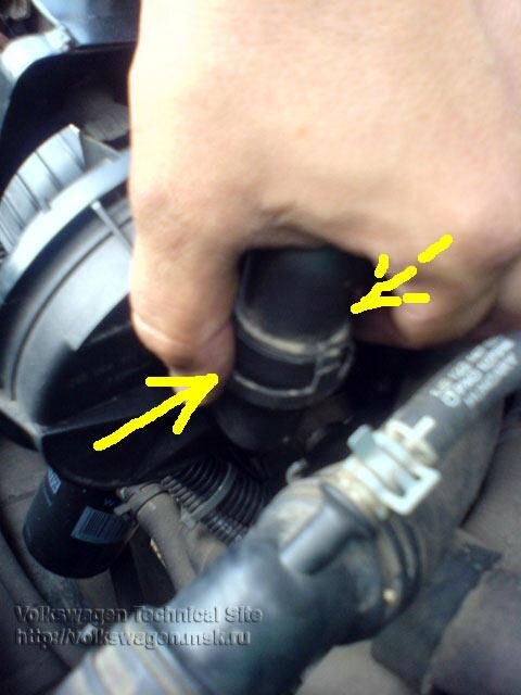 Данный двигатель устанавливался на VW Golf 4/Bora, VW Polo, Skoda Octavia, Audi A3, Seat Leon… Вроде бы простая операция – замена свечей, но на данном двигателе все оказалось довольно непросто. Дело в том, что свечи находятся под впускным коллектором так, что даже высоковольтные провода отсоединить не представляется возможным. ФОТО 1 и 2: Отсоединяем пластиковые шланги от насоса дополнительного воздуха (кажется, он так называется). Для того чтобы отсоединить шланги нужно нажать пальцами на рифленые края коннектора, как показано на фото и потянуть на себя.