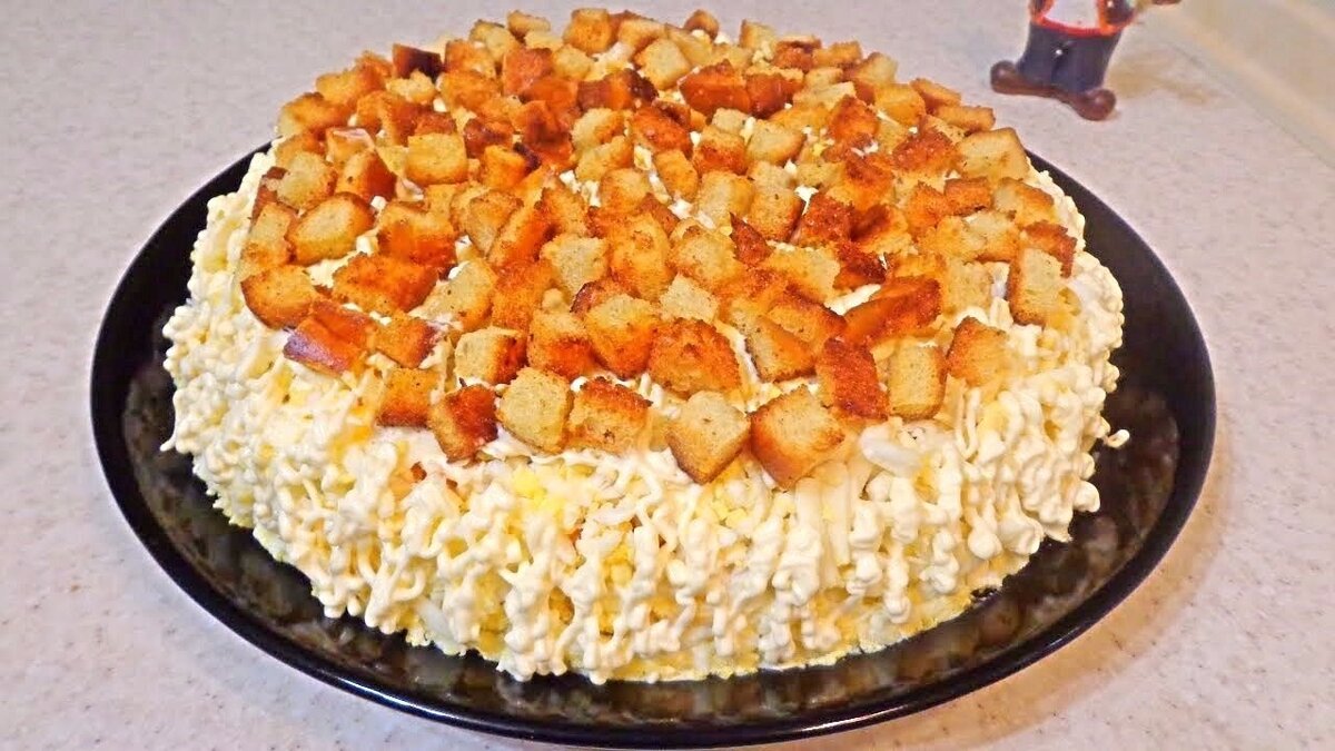 Итак, первый слой – картофель. Затем выкладываем половину сардин, потом половину моркови, теперь кладем яйца, также только половину получившегося количества. Наверх кладем половину лука и половину гренок, на гренки майонез не кладем.