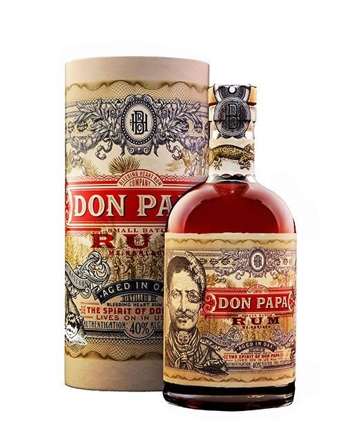 Страна: Филиппины Производитель: Bleeding Heart Rum Company Категория: промышленный ром Особенность: без холодной фильтрации Выдержка: 7 лет, в бочках из-под бурбона Крепость: 40%об. Цвет: насыщенный янтарный Аромат: выразительный и насыщенный, с преобладанием нот цукатов- цитрусовых, ананаса, банана, манго, папайи, а также с оттенками карамели, специй и черного шоколада Вкус: сложный, полнотелый, сладковатый, со слегка маслянистой текстурой, нотами какао и корицы, дымного дуба, шоколада и миндаля в длительном послевкусии Температура подачи: 10-22 °С Рекомендации по употреблению: превосходен в качестве составляющей коктейлей и лонг-дринков или как самостоятельный напиток Дон Папа - это дань уважения папе И́сио, харизматичному герою Филиппин, который в 1890-х годах помог изгнать испанцев с острова и завоевать независимость для страны. Филиппины имеют долгую историю культивации сахарного тростника местного сорта Но́бле, впоследствии распространившегося по всему миру. На пышном, плодо