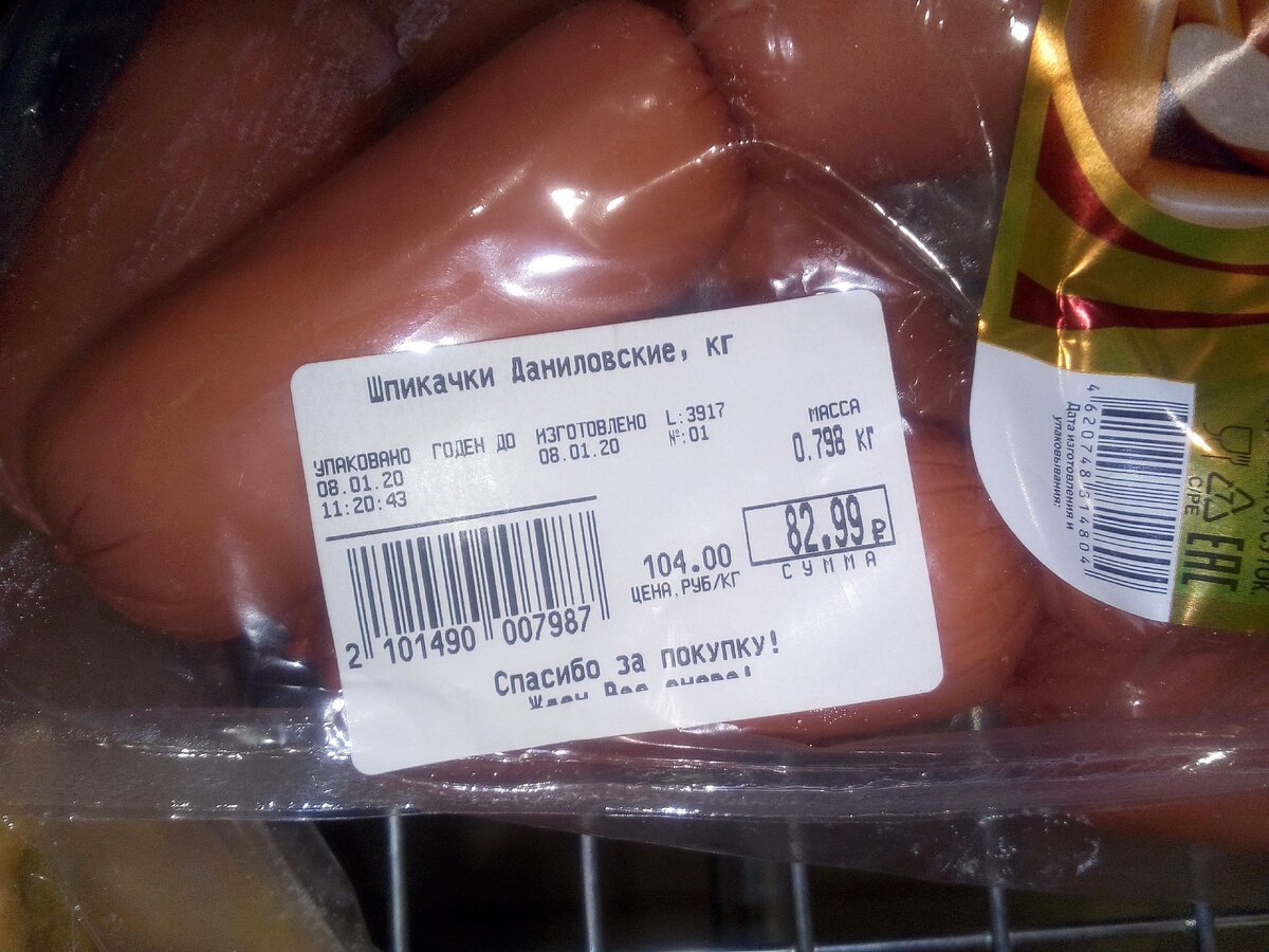 Это "Шпикачки Даниловские" по 104 рубля за 1 кг.